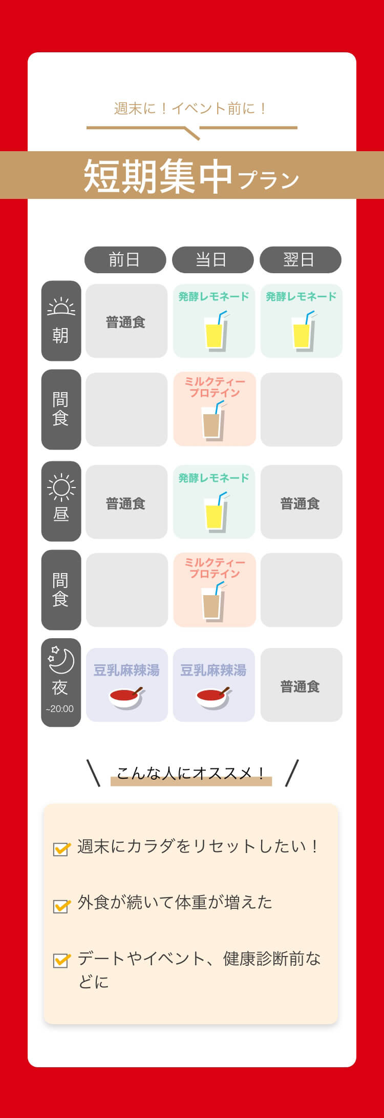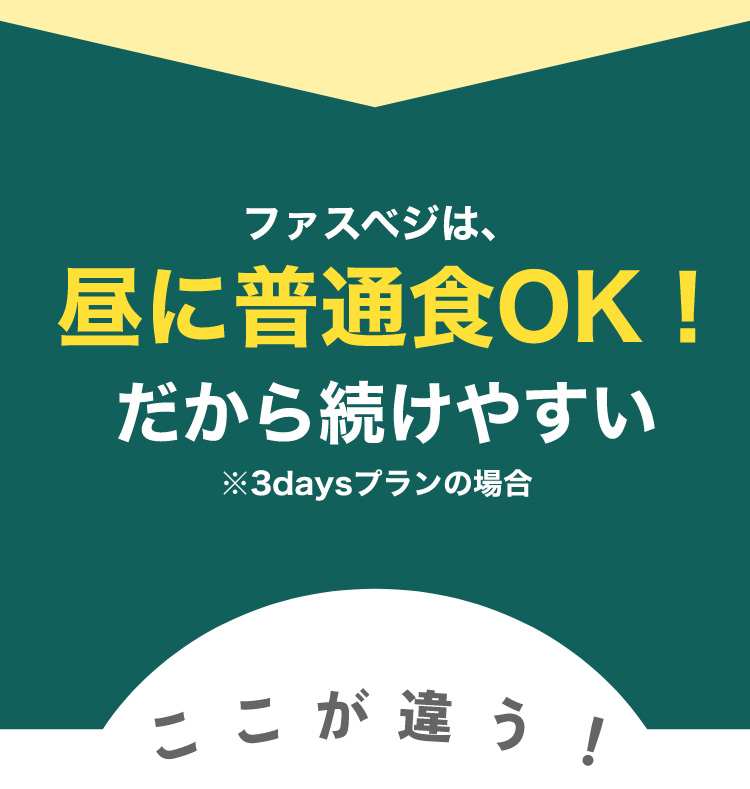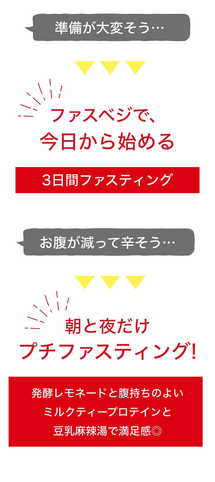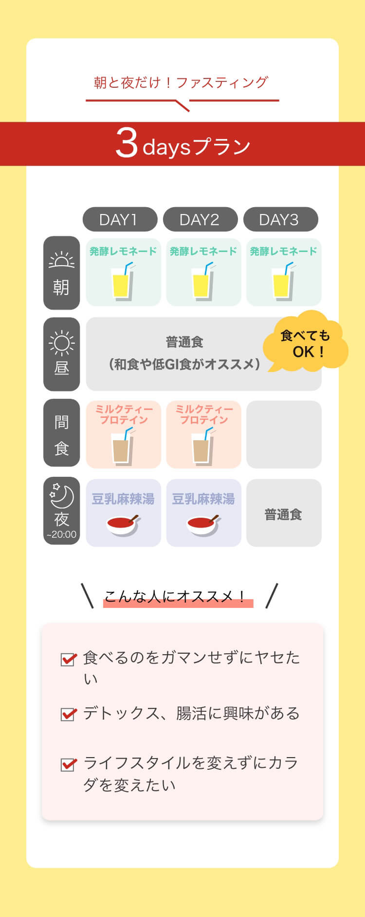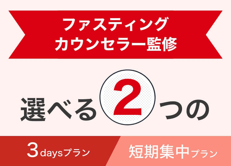 どちらもファスティング効果が期待できます。ご自身のライフスタイルでどちらのプランにするかをお選びください。はじめての方には、「3daysプラン」をオススメします。