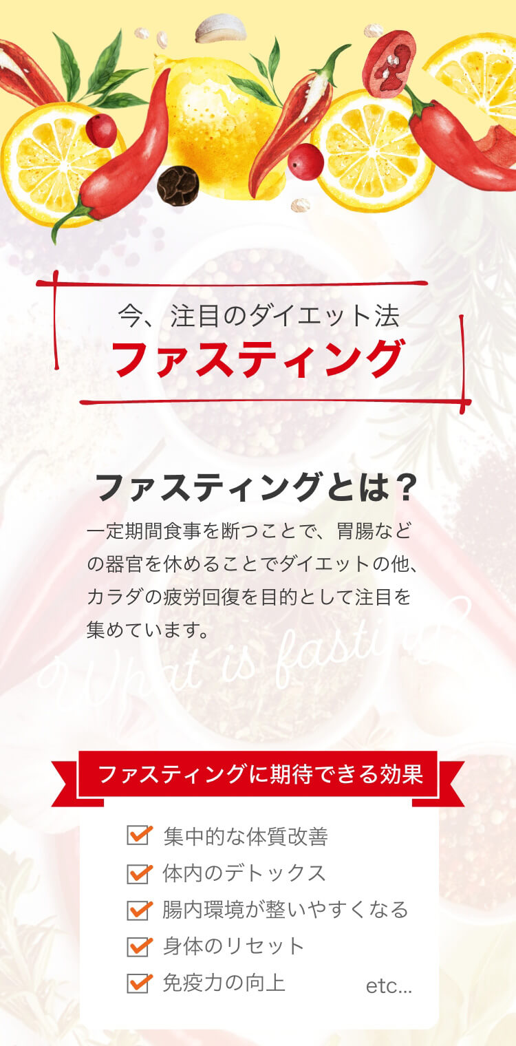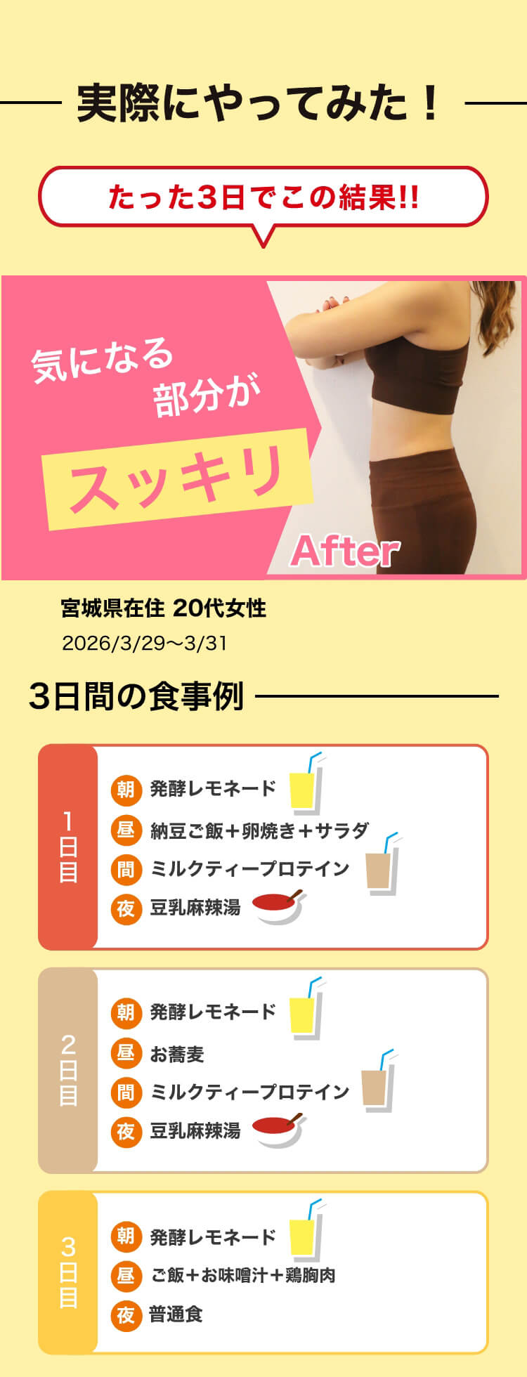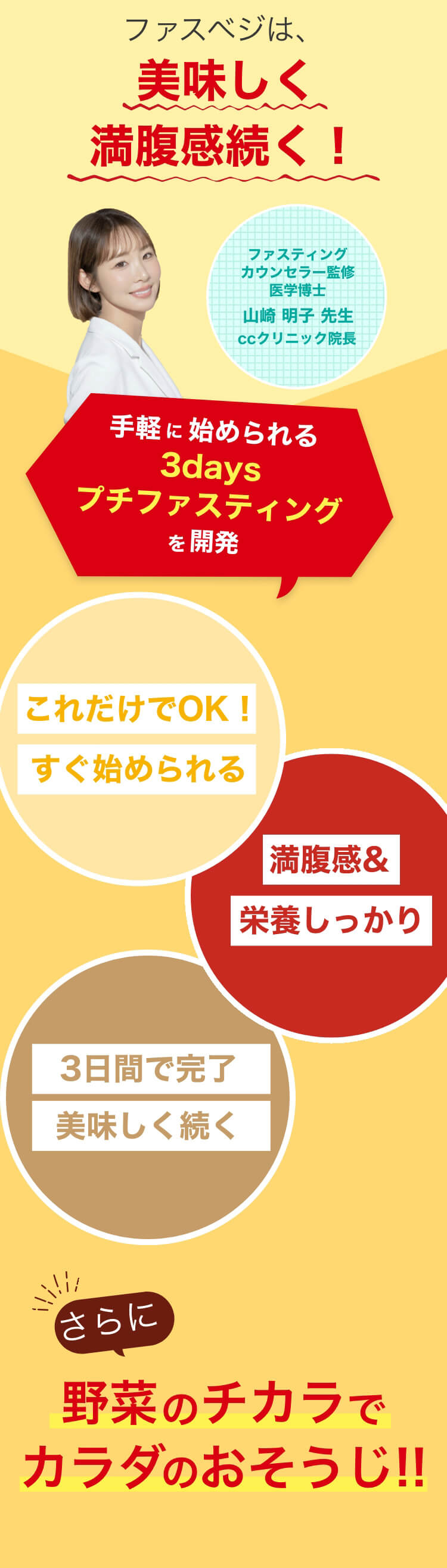 どちらもファスティング効果が期待できます。ご自身のライフスタイルでどちらのプランにするかをお選びください。はじめての方には、「3daysプラン」をオススメします。
