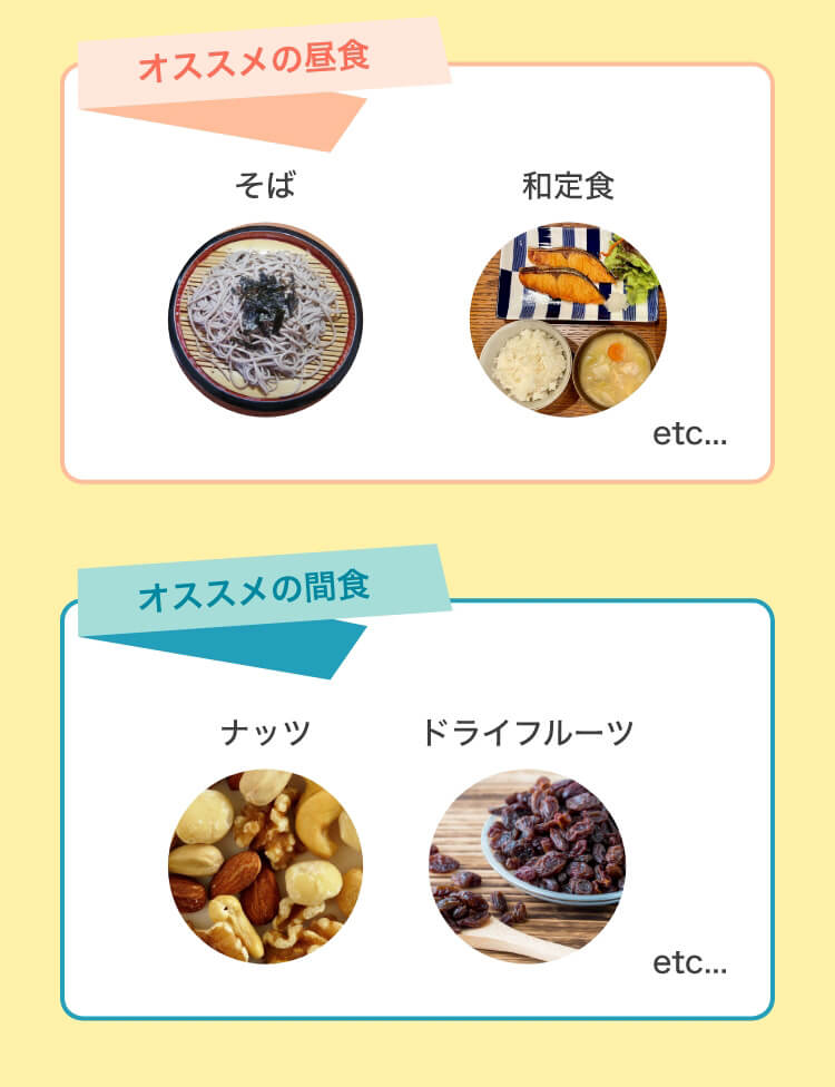 お昼:そばなどの和食や野菜を中心とした低GI食を推奨しております。