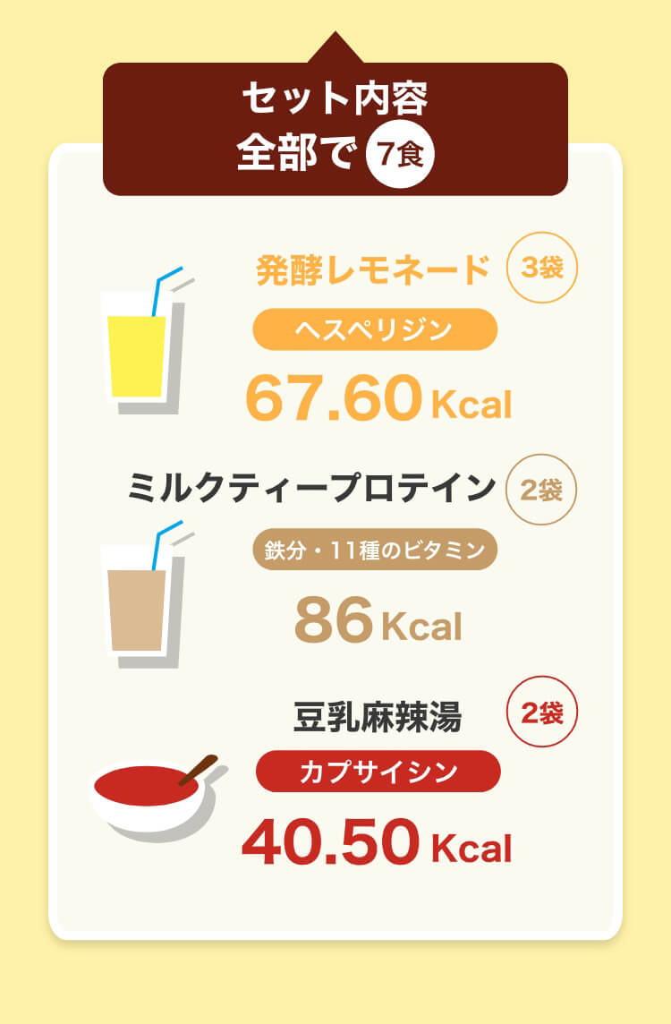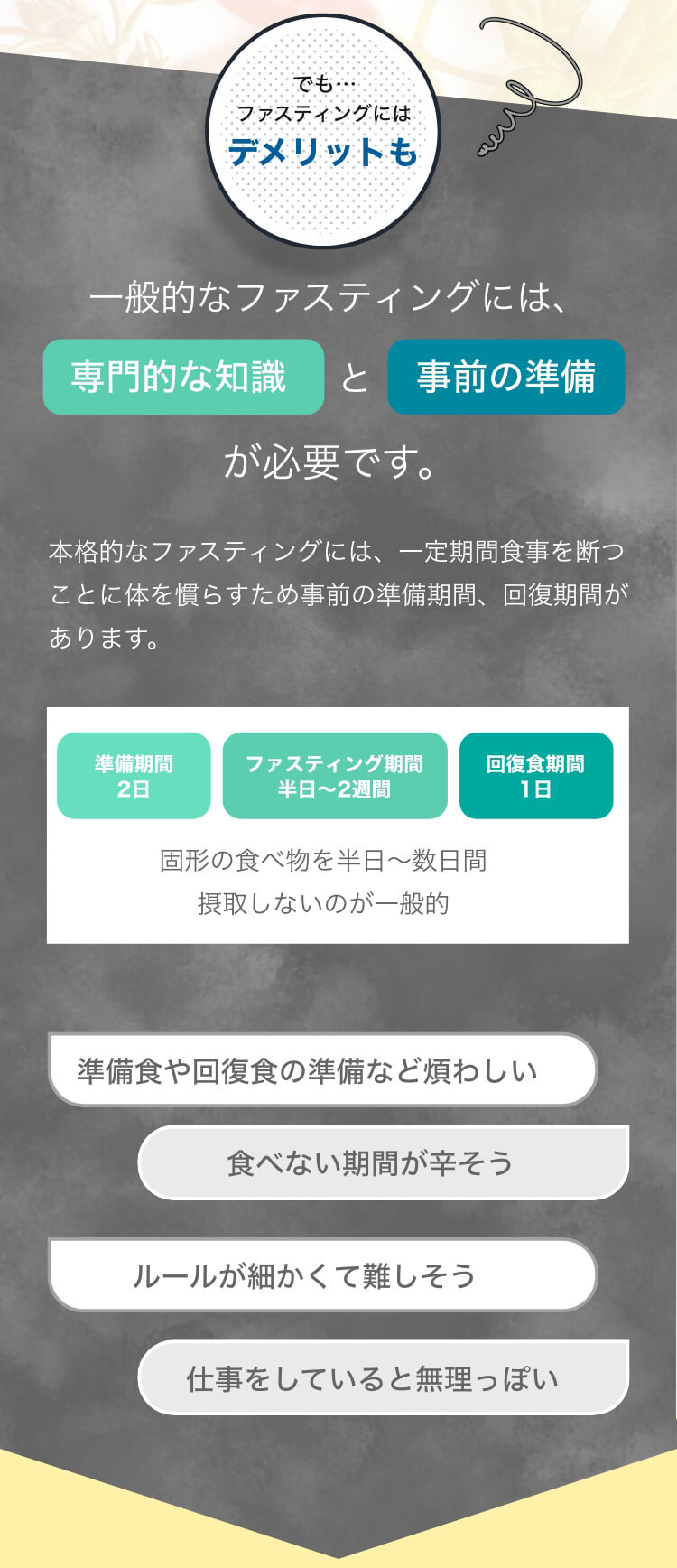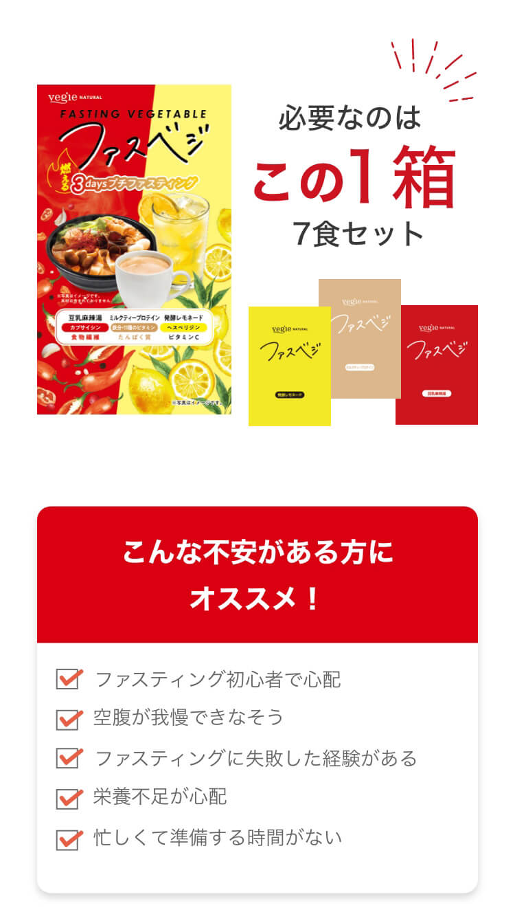 短期集中プランを含めた「3daysプチファスティング」1箱分を使用した場合、準備食や回復食は必要ありません。ただし、プチファスティング後は野菜スープやおかゆ・うどんなど、消化の良いものをオススメしております。